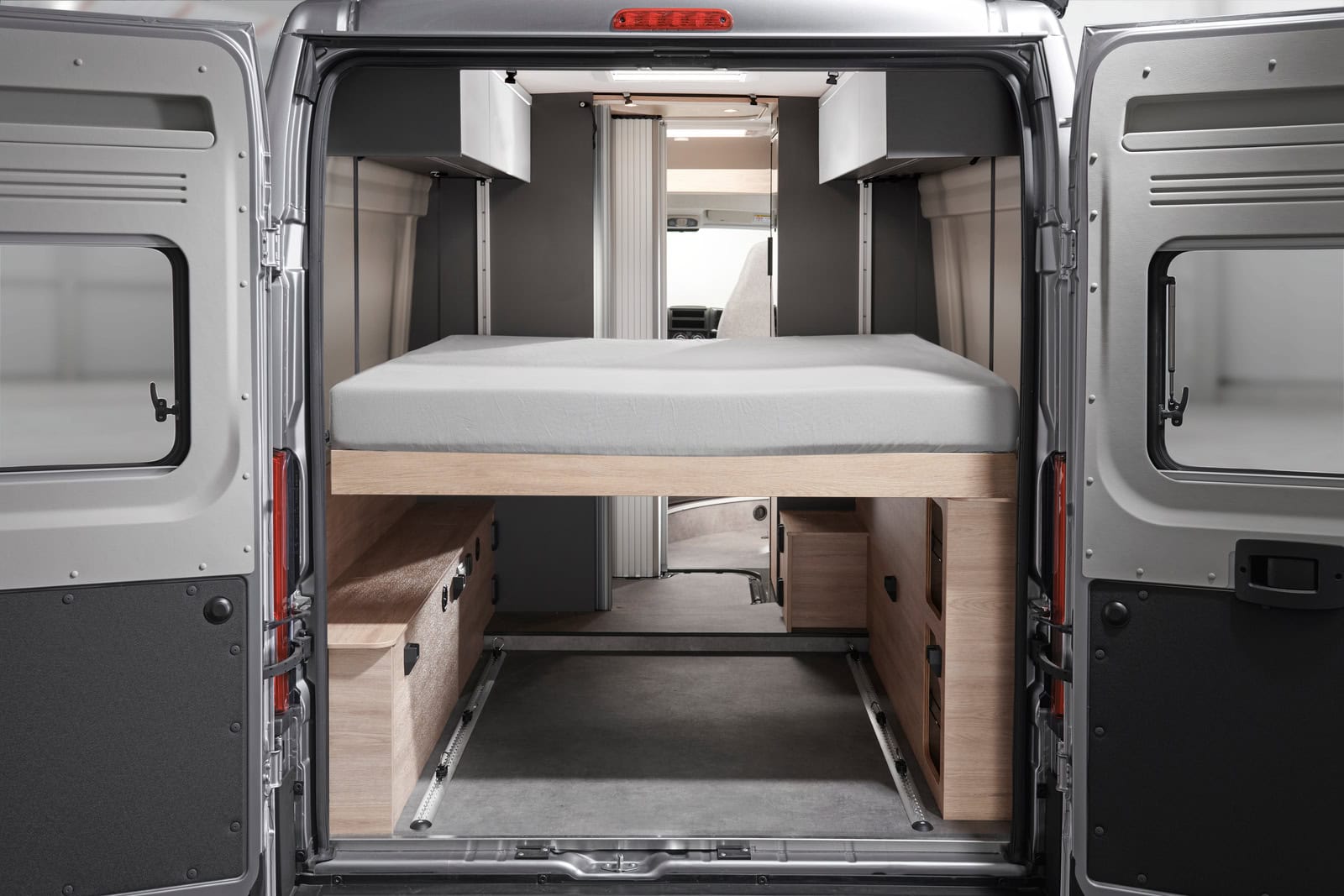 Das längs eingebaute Hubbett misst bis zu 200 mal 156 Zentimeter und ist mit einer elf Zentimeter dicken Kaltschaummatratze ausgestattet. Der manuelle Hubmechanismus erlaubt eine stufenlose Höhenverstellung, sodass die Liegehöhe individuell gewählt werden kann. In oberster Position entsteht ein bis zu 133 Zentimeter hoher Stauraum im Heck. Mit einer Tiefe von 180 und einer Breite von 123 Zentimetern eignet sich dieser auch für größere Ausrüstungsgegenstände wie Fahrräder.