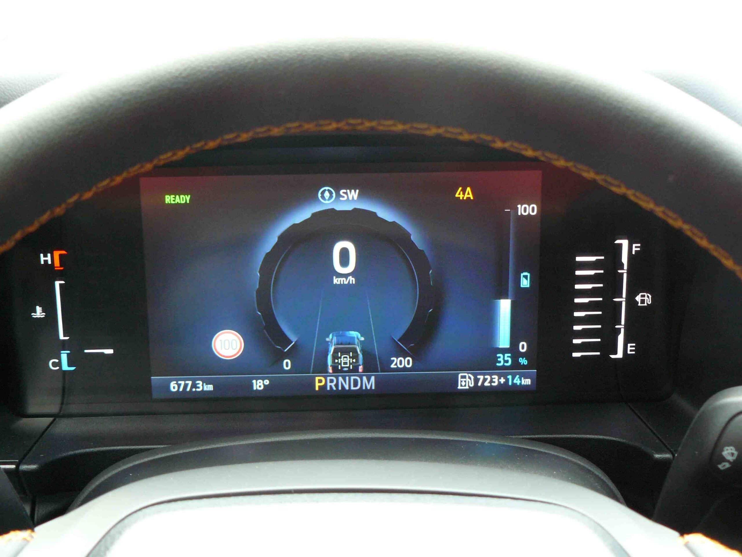 Weiter vorn überzeugt die erste Reihe im Fahrerhaus des Ford Ranger PHEV zunächst mit reichlich Platz und zwei recht bequemen Sesseln. Die Bedienung zeigt markentypisch Höhen und Tiefen. Da wären konfigurierbare Armaturen, bei maximaler Bestückung schon übervoll. Sehr präzise lässt sich auf Wunsch der Aggregatzustand rund um den Hybridantrieb mit Batteriekapazität, Stromentnahme und Rekuperation – grüne Anzeige bei Gas weg – verfolgen.