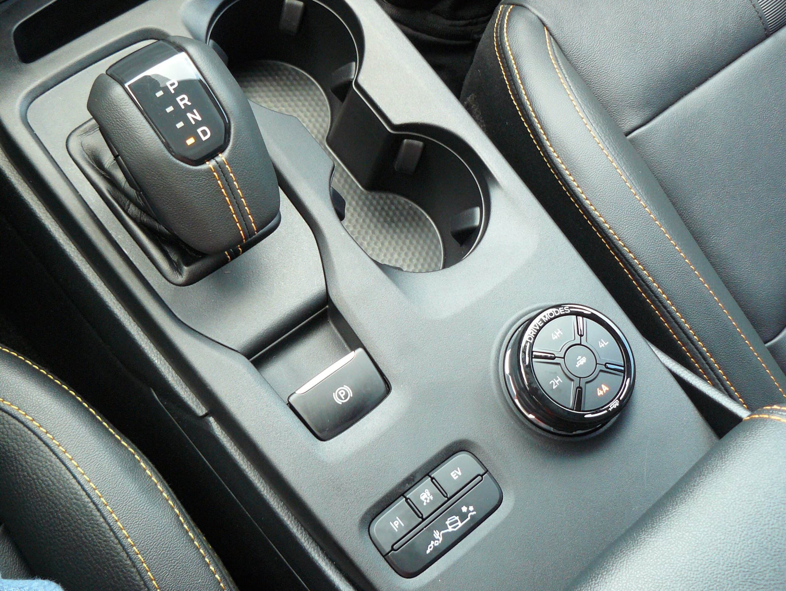 Dazu gesellen sich ein flächendeckender Monitor in Wagenmitte und praktische Drehregler für die Klimatisierung. Ein weiterer Regler für die Lautstärke des Infotainments. Schließlich wäre da die Mittelkonsole als Schaltzentrale für den komplexen Antrieb mit Bedienknauf für die Fahrtrichtung, Drehschalter für die Wahl des Zweirad- oder Vierradantriebs und weiterem Einfluss auf den Gang des Ranger PHEV.