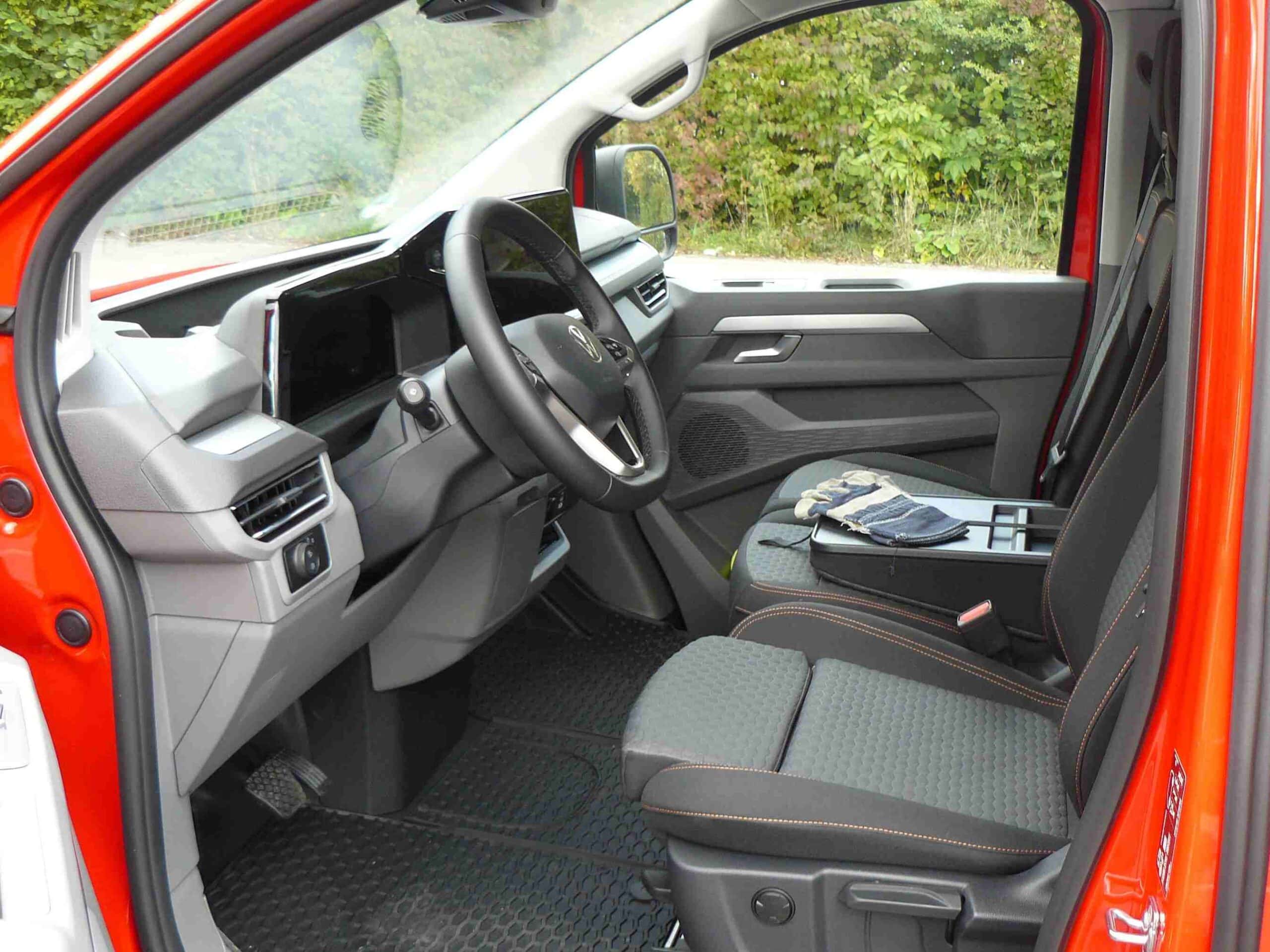 Auch sachliche Argumente sprechen für den Platz vorne links im VW Transporter. Vor allem hier in einer Top-Ausführung mit verlängerbarem Sitzkissen – eine Wohltat für lange Strecken. Dazu zählt ebenfalls die größere Bewegungsfreiheit im Vergleich zum Vorgänger, auch die üppigen Ablagen. Einschließlich des neuen, sehr tiefen und somit Laptop-gerechten zweiten Handschuhfachs – der Beifahrer-Airbag ist nach oben unter das Dach ausgewichen. Tolle Idee, von welchem Fabrikat auch immer. Die gesamte Umgebung wirkt solide und gepflegt, ein angenehmer Arbeitsplatz.