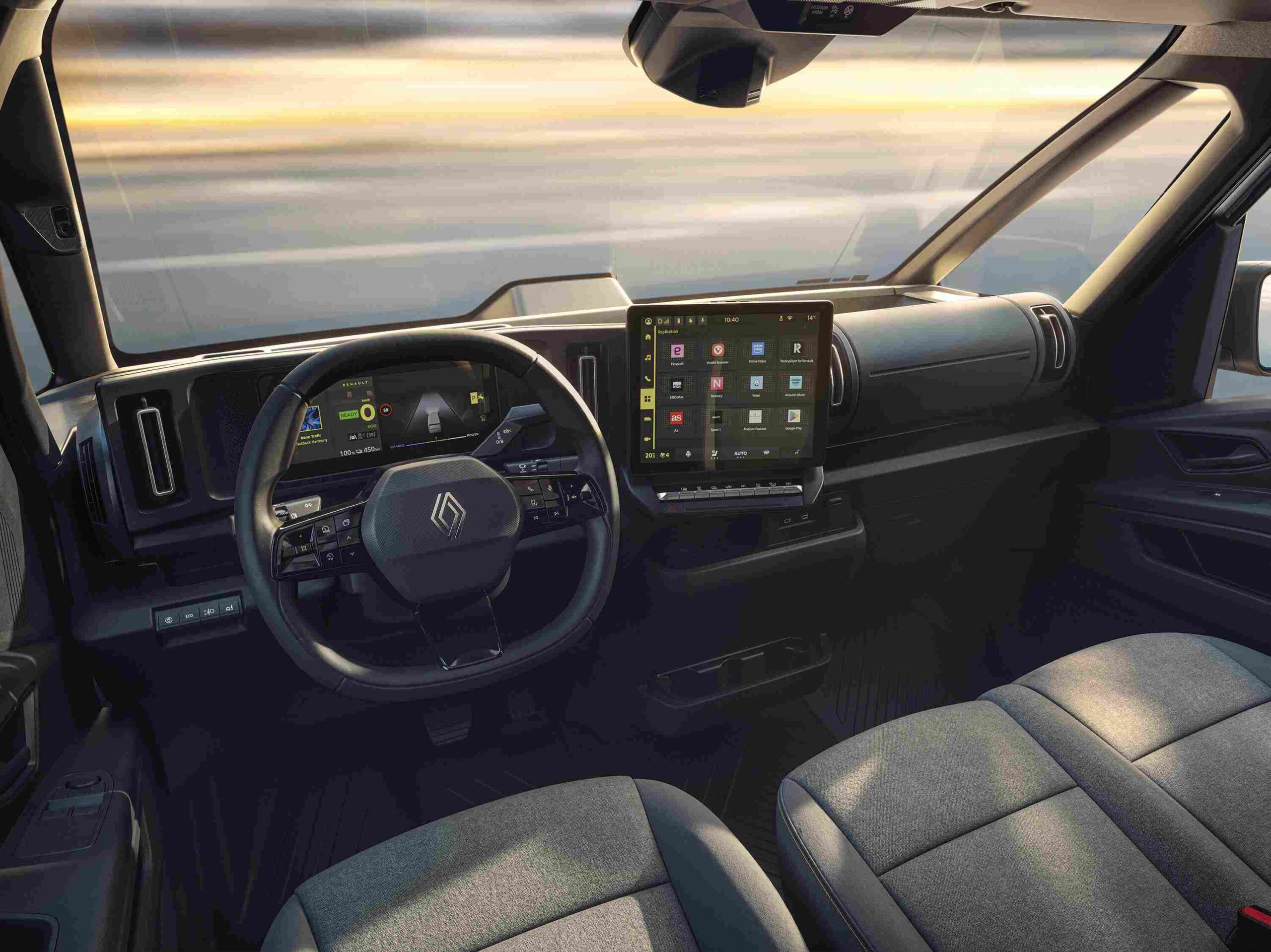 Rechterhand kommt ein quadratisch gestalteter und auf den Fahrer ausgerichteter Monitor im Format zwölf Zoll hinzu. Das Navigationssystem ist, so Renault, speziell auf Transporter ausgelegt und soll ungeeignete Strecken vermeiden. Ebenso lässt sich eine Fahrstilbewertung abrufen.
