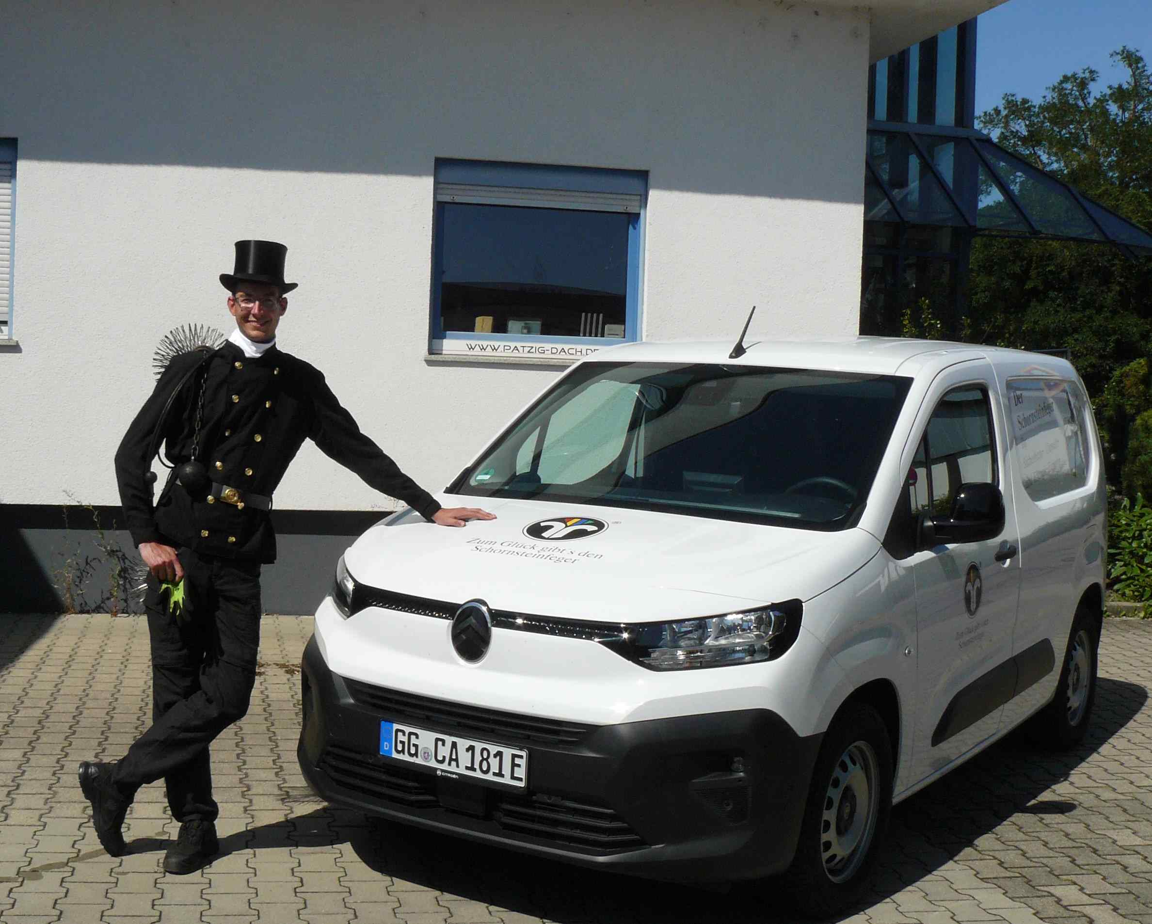 Für den Treff hat er sich Manuel Kossok im Wortsinn zünftig angezogen. Wir lernen: traditionell tragen Auszubildende des Berufsstands schwarze Knöpfe an der Jacke, jene der Gesellen sind silbern. Gold ist den Meistern vorbehalten. Der Citroen E-Berlingo im Schornsteinfeger-Outfit verzichtet weitgehend auf Schmuck. Weißer Lack, schlichte Stoßfänger, die Berufskleidung beschränkt sich auf die Beklebung.