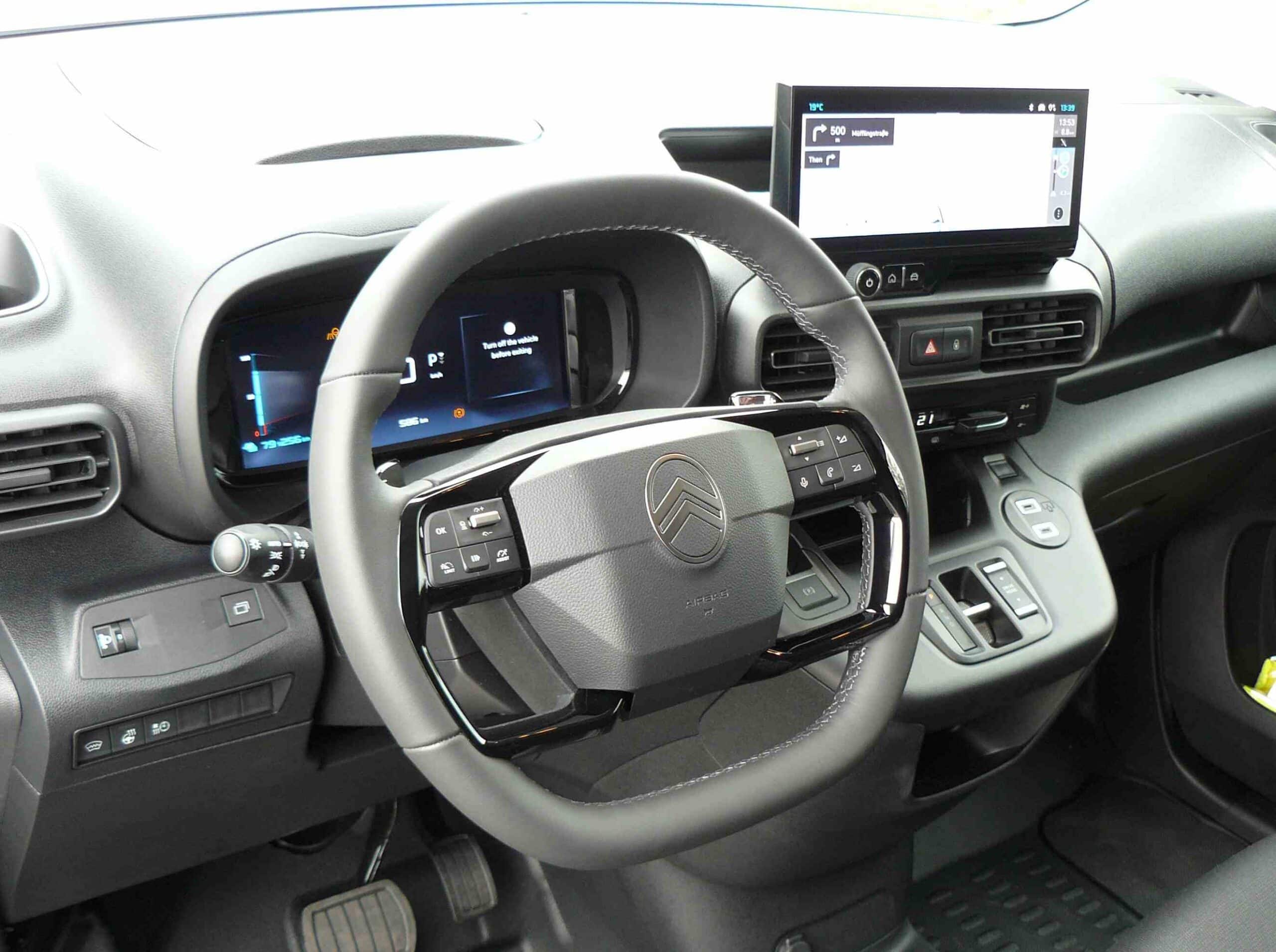Das knapp bemessene Cockpit wirkt etwas düster, als hätte es sich der Berufskleidung der Kaminkehrer angepasst. Ohne fesche Goldknöpfe, die verwendeten Materialien sind eher schlicht. Eine Ausnahme ist der kuschelige Fahrersitz, eingeführt anlässlich des jüngsten Facelifts. Der Beifahrer-Doppelsitz taugt nur sehr bedingt für zwei, die Plätze sind schmal, die Mittelkonsole raubt Beinfreiheit. Dort hat Citroen die Bedienung dezent überarbeitet, auch deren Tasten entsprechen dem großen Bruder Jumpy. Das gilt auch für den Start per Zündschlüssel oder die Rekuperations-Paddel hinter dem Lenkrad und ihrer Wirkungsweise. Im Normalbetrieb verzögert der Elektriker ähnlich wie mit Motorbremse. Zwar kann er nicht leichtfüßig dahingleiten, beherrscht indes den Einpedal-Modus, Geschmackssache. Wobei der wenig feinfühlige Übergang zwischen Rekuperation und Reibbremse arg ruckelig erfolgt.